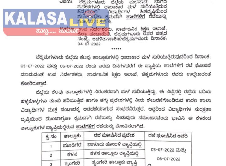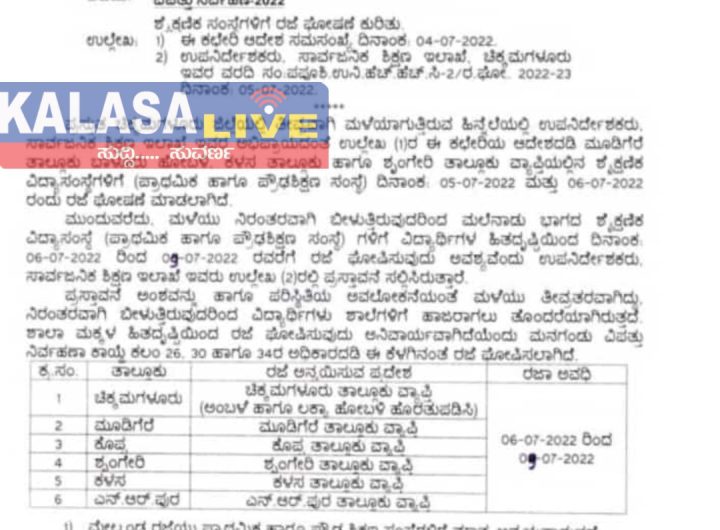 ಮುಂದಿನ 2 ದಿನಗಳ ಕಾಲ ಶಾಲೆಗಳಿಗೆ ರಜೆ ಘೋಷಣೆ! ಮಲೆನಾಡಿನ ಭಾಗದಲ್ಲಿ ಕಳೆದೆರಡು ದಿನಗಳಿಂದ ಸುರಿಯುತ್ತಿರುವ ಭಾರಿ ಮಳೆಯಿಂದ ಪ್ರವಾಹ ಪರಿಸ್ಥಿತಿ...