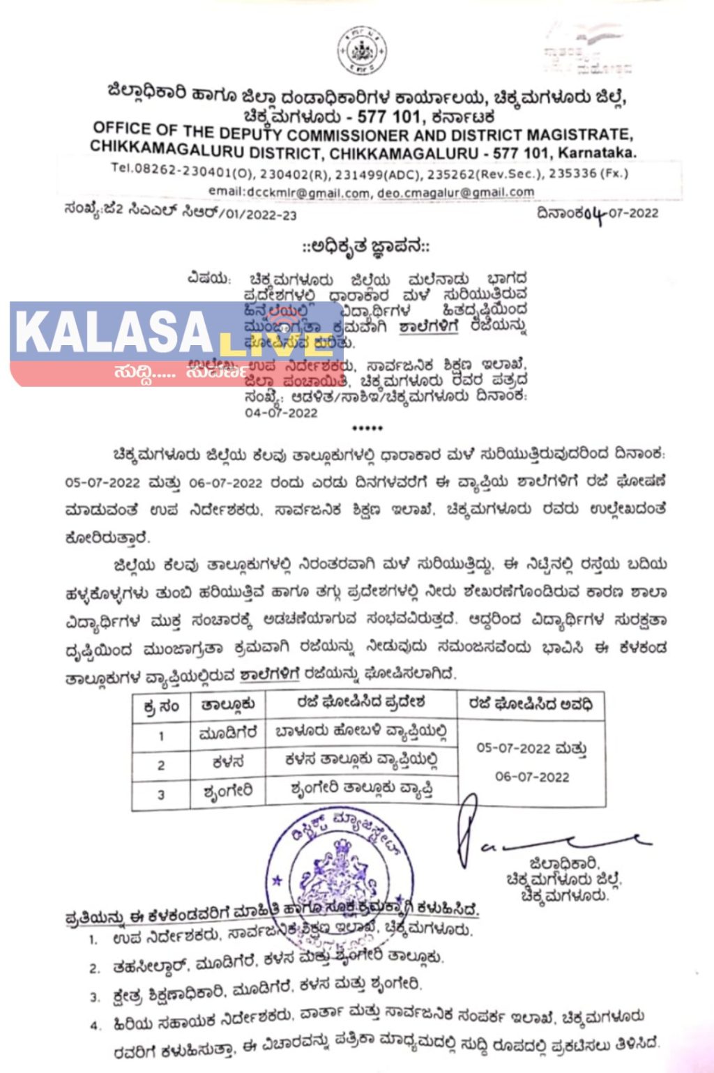 ಮಲೆನಾಡಿನ ಭಾಗದಲ್ಲಿ ಕಳೆದೆರಡು ದಿನಗಳಿಂದ ಸುರಿಯುತ್ತಿರುವ ಭಾರಿ ಮಳೆಯಿಂದ ಪ್ರವಾಹ ಪರಿಸ್ಥಿತಿ ಎದುರಾಗಿದ್ದು, ಈ ಹಿನ್ನೆಲೆಯಲ್ಲಿ ಶೃಂಗೇರಿ ಹಾಗೂ ಕಳಸ ತಾಲ್ಲೂಕಿನ ಎಲ್ಲಾ ಶಾಲೆಗಳಿಗೆ 2 ದಿನಗಳ ಕಾಲ ರಜೆ ಘೋಷಿಸಿ ಜಿಲ್ಲಾಧಿಕಾರಿ ಕೆ.ಎನ್ ರಮೇಶ್ ಆದೇಶ ಹೊರಡಿಸಿದ್ದಾರೆ.