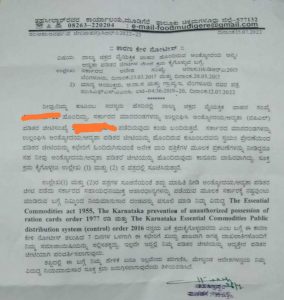 ಪಡಿತರ ಚೀಟಿಯಿಂದ ಸರ್ಕಾರದ ಸಹಾಯಧನಯುಕ್ತ ಆಹಾರಧಾನ್ಯಗಳನ್ನು ಪಡೆಯುವ ಮೂಲಕ ಸರ್ಕಾರಕ್ಕೆ ನಷ್ಟವುಂಟು ಮಾಡಿರುವ ಬಗ್ಗೆ ನಿಯಮಾನುಸಾರ ದಂಡವನ್ನು ವಸೂಲಿ ಮಾಡಿ ನಿಮ್ಮ ವಿರುದ್ಧ ಕ್ರಮ ಯಾಕೆ ಕೈಗೊಳ್ಳಬಾರದು ಎಂದು ಕಾರಣ ಕೇಳಿ ನೋಟಿಸು ನೀಡಿದೆ.