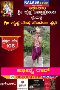 ಕಳಸ ಕಳಸ ತಾಲ್ಲೂಕು ಶ್ರೀ ಕೃಷ್ಣ ವೇಷ ಸ್ಪರ್ಧೆ ಸ್ಪರ್ಧಿ ನಂ: 106 ಅಭೀಘ್ನ ರಾವ್ SUDISH SUVARNA August 28, 2022 Spread the love Post navigation Previous ಶ್ರೀ ಕೃಷ್ಣ ವೇಷ ಸ್ಪರ್ಧೆ ಸ್ಪರ್ಧಿ ನಂ: 105 ಆರ್ವಿ ಗೌಡ,Next ಶ್ರೀ ಕೃಷ್ಣ ವೇಷ ಸ್ಪರ್ಧೆ ಸ್ಪರ್ಧಿ ನಂ: 107 ಯಾಸ್ವಿ, Leave a Reply Cancel replyYour email address will not be published. Required fields are marked *Comment * Name * Email * Website Save my name, email, and website in this browser for the next time I comment. Related Stories ಹೊರನಾಡಿನಲ್ಲಿ ಪೊರಿಪಿನ ಮಾತೆ ಜಲದುರ್ಗೆ ನಾಟಕ ಏಪ್ರಿಲ್ 19ಕ್ಕೆ ಕಳಸ ತಾಲ್ಲೂಕು ಕ್ರೀಡೆ ಹೊರನಾಡು ಹೊರನಾಡಿನಲ್ಲಿ ಪೊರಿಪಿನ ಮಾತೆ ಜಲದುರ್ಗೆ ನಾಟಕ ಏಪ್ರಿಲ್ 19ಕ್ಕೆ April 18, 2026 ಕಳಸದಲ್ಲಿ ಕಾಡುಕೋಣನ ಅಟ್ಟಹಾಸಕ್ಕೆ ಬಲಿಯಾದ ಬಡ ಕಾರ್ಮಿಕ; ತಬ್ಬಲಿಯಾದ ಪುಟ್ಟ ಕಂದಮ್ಮ, ಗರ್ಭಿಣಿ ಪತ್ನಿಯ ಆಕ್ರಂದನ ಕಳಸ ಕಳಸ ತಾಲ್ಲೂಕು ಕ್ರೈಂ ಕಳಸದಲ್ಲಿ ಕಾಡುಕೋಣನ ಅಟ್ಟಹಾಸಕ್ಕೆ ಬಲಿಯಾದ ಬಡ ಕಾರ್ಮಿಕ; ತಬ್ಬಲಿಯಾದ ಪುಟ್ಟ ಕಂದಮ್ಮ, ಗರ್ಭಿಣಿ ಪತ್ನಿಯ ಆಕ್ರಂದನ April 18, 2026 ಬಾಳೆಹೊಳೆ: 23ನೇ ವರ್ಷದ ‘ವಸಂತ ವೇದ ಶಿಬಿರ’ಕ್ಕೆ ಚಾಲನೆ ಕಳಸ ಕಳಸ ತಾಲ್ಲೂಕು ಧಾರ್ಮಿಕ ಬಾಳೆಹೊಳೆ: 23ನೇ ವರ್ಷದ ‘ವಸಂತ ವೇದ ಶಿಬಿರ’ಕ್ಕೆ ಚಾಲನೆ April 17, 2026