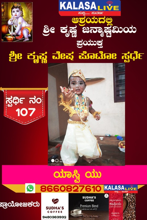 ಕಳಸ ಕಳಸ ತಾಲ್ಲೂಕು ಶ್ರೀ ಕೃಷ್ಣ ವೇಷ ಸ್ಪರ್ಧೆ ಸ್ಪರ್ಧಿ ನಂ: 107 ಯಾಸ್ವಿ, SUDISH SUVARNA August 28, 2022 Spread the love Post navigation Previous ಶ್ರೀ ಕೃಷ್ಣ ವೇಷ ಸ್ಪರ್ಧೆ ಸ್ಪರ್ಧಿ ನಂ: 106 ಅಭೀಘ್ನ ರಾವ್Next ಶ್ರೀ ಕೃಷ್ಣ ವೇಷ ಸ್ಪರ್ಧೆ ಸ್ಪರ್ಧಿ ನಂ: 108 ಪ್ರಗತಿ, Leave a Reply Cancel replyYour email address will not be published. Required fields are marked *Comment * Name * Email * Website Save my name, email, and website in this browser for the next time I comment. Related Stories ಹೊರನಾಡಿನಲ್ಲಿ ಪೊರಿಪಿನ ಮಾತೆ ಜಲದುರ್ಗೆ ನಾಟಕ ಏಪ್ರಿಲ್ 19ಕ್ಕೆ ಕಳಸ ತಾಲ್ಲೂಕು ಕ್ರೀಡೆ ಹೊರನಾಡು ಹೊರನಾಡಿನಲ್ಲಿ ಪೊರಿಪಿನ ಮಾತೆ ಜಲದುರ್ಗೆ ನಾಟಕ ಏಪ್ರಿಲ್ 19ಕ್ಕೆ April 18, 2026 ಕಳಸದಲ್ಲಿ ಕಾಡುಕೋಣನ ಅಟ್ಟಹಾಸಕ್ಕೆ ಬಲಿಯಾದ ಬಡ ಕಾರ್ಮಿಕ; ತಬ್ಬಲಿಯಾದ ಪುಟ್ಟ ಕಂದಮ್ಮ, ಗರ್ಭಿಣಿ ಪತ್ನಿಯ ಆಕ್ರಂದನ ಕಳಸ ಕಳಸ ತಾಲ್ಲೂಕು ಕ್ರೈಂ ಕಳಸದಲ್ಲಿ ಕಾಡುಕೋಣನ ಅಟ್ಟಹಾಸಕ್ಕೆ ಬಲಿಯಾದ ಬಡ ಕಾರ್ಮಿಕ; ತಬ್ಬಲಿಯಾದ ಪುಟ್ಟ ಕಂದಮ್ಮ, ಗರ್ಭಿಣಿ ಪತ್ನಿಯ ಆಕ್ರಂದನ April 18, 2026 ಬಾಳೆಹೊಳೆ: 23ನೇ ವರ್ಷದ ‘ವಸಂತ ವೇದ ಶಿಬಿರ’ಕ್ಕೆ ಚಾಲನೆ ಕಳಸ ಕಳಸ ತಾಲ್ಲೂಕು ಧಾರ್ಮಿಕ ಬಾಳೆಹೊಳೆ: 23ನೇ ವರ್ಷದ ‘ವಸಂತ ವೇದ ಶಿಬಿರ’ಕ್ಕೆ ಚಾಲನೆ April 17, 2026