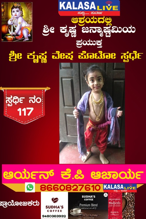ಕಳಸ ಕಳಸ ತಾಲ್ಲೂಕು ಶ್ರೀ ಕೃಷ್ಣ ವೇಷ ಸ್ಪರ್ಧೆ ಸ್ಪರ್ಧಿ ನಂ: 117 ಆರ್ಯನ್ ಕೆ.ಪಿ ಆಚಾರ್ಯ, SUDISH SUVARNA August 28, 2022 Spread the love Post navigation Previous ಶ್ರೀ ಕೃಷ್ಣ ವೇಷ ಸ್ಪರ್ಧೆ ಸ್ಪರ್ಧಿ ನಂ: 116 ಪ್ರತ್ಯುಶ್ ಎನ್,Next ಶ್ರೀ ಕೃಷ್ಣ ವೇಷ ಸ್ಪರ್ಧೆ ಸ್ಪರ್ಧಿ ನಂ: 118 ದಕ್ಷಾ ಎಂ, Leave a Reply Cancel replyYour email address will not be published. Required fields are marked *Comment * Name * Email * Website Save my name, email, and website in this browser for the next time I comment. Related Stories ಹೊರನಾಡಿನಲ್ಲಿ ಪೊರಿಪಿನ ಮಾತೆ ಜಲದುರ್ಗೆ ನಾಟಕ ಏಪ್ರಿಲ್ 19ಕ್ಕೆ ಕಳಸ ತಾಲ್ಲೂಕು ಕ್ರೀಡೆ ಹೊರನಾಡು ಹೊರನಾಡಿನಲ್ಲಿ ಪೊರಿಪಿನ ಮಾತೆ ಜಲದುರ್ಗೆ ನಾಟಕ ಏಪ್ರಿಲ್ 19ಕ್ಕೆ April 18, 2026 ಕಳಸದಲ್ಲಿ ಕಾಡುಕೋಣನ ಅಟ್ಟಹಾಸಕ್ಕೆ ಬಲಿಯಾದ ಬಡ ಕಾರ್ಮಿಕ; ತಬ್ಬಲಿಯಾದ ಪುಟ್ಟ ಕಂದಮ್ಮ, ಗರ್ಭಿಣಿ ಪತ್ನಿಯ ಆಕ್ರಂದನ ಕಳಸ ಕಳಸ ತಾಲ್ಲೂಕು ಕ್ರೈಂ ಕಳಸದಲ್ಲಿ ಕಾಡುಕೋಣನ ಅಟ್ಟಹಾಸಕ್ಕೆ ಬಲಿಯಾದ ಬಡ ಕಾರ್ಮಿಕ; ತಬ್ಬಲಿಯಾದ ಪುಟ್ಟ ಕಂದಮ್ಮ, ಗರ್ಭಿಣಿ ಪತ್ನಿಯ ಆಕ್ರಂದನ April 18, 2026 ಬಾಳೆಹೊಳೆ: 23ನೇ ವರ್ಷದ ‘ವಸಂತ ವೇದ ಶಿಬಿರ’ಕ್ಕೆ ಚಾಲನೆ ಕಳಸ ಕಳಸ ತಾಲ್ಲೂಕು ಧಾರ್ಮಿಕ ಬಾಳೆಹೊಳೆ: 23ನೇ ವರ್ಷದ ‘ವಸಂತ ವೇದ ಶಿಬಿರ’ಕ್ಕೆ ಚಾಲನೆ April 17, 2026