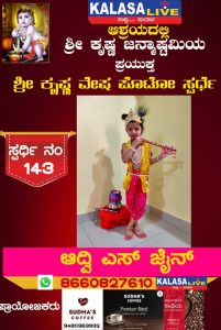 ಕಳಸ ಕಳಸ ತಾಲ್ಲೂಕು ಶ್ರೀ ಕೃಷ್ಣ ವೇಷ ಸ್ಪರ್ಧೆ ಸ್ಪರ್ಧಿ ನಂ:143 ಆದ್ವಿ ಎಸ್ ಜೈನ್, SUDISH SUVARNA August 28, 2022 Spread the love Post navigation Previous ಶ್ರೀ ಕೃಷ್ಣ ವೇಷ ಸ್ಪರ್ಧೆ ಸ್ಪರ್ಧಿ ನಂ: 142 ಅದ್ವಿತ್ ಜೈನ್,Next ಶ್ರೀ ಕೃಷ್ಣ ವೇಷ ಸ್ಪರ್ಧೆ ಸ್ಪರ್ಧಿ ನಂ:144 ಯಶಿಕ ಮೂಲ್ಯ, Leave a Reply Cancel replyYour email address will not be published. Required fields are marked *Comment * Name * Email * Website Save my name, email, and website in this browser for the next time I comment. Related Stories ಹೊರನಾಡಿನಲ್ಲಿ ಪೊರಿಪಿನ ಮಾತೆ ಜಲದುರ್ಗೆ ನಾಟಕ ಏಪ್ರಿಲ್ 19ಕ್ಕೆ ಕಳಸ ತಾಲ್ಲೂಕು ಕ್ರೀಡೆ ಹೊರನಾಡು ಹೊರನಾಡಿನಲ್ಲಿ ಪೊರಿಪಿನ ಮಾತೆ ಜಲದುರ್ಗೆ ನಾಟಕ ಏಪ್ರಿಲ್ 19ಕ್ಕೆ April 18, 2026 ಕಳಸದಲ್ಲಿ ಕಾಡುಕೋಣನ ಅಟ್ಟಹಾಸಕ್ಕೆ ಬಲಿಯಾದ ಬಡ ಕಾರ್ಮಿಕ; ತಬ್ಬಲಿಯಾದ ಪುಟ್ಟ ಕಂದಮ್ಮ, ಗರ್ಭಿಣಿ ಪತ್ನಿಯ ಆಕ್ರಂದನ ಕಳಸ ಕಳಸ ತಾಲ್ಲೂಕು ಕ್ರೈಂ ಕಳಸದಲ್ಲಿ ಕಾಡುಕೋಣನ ಅಟ್ಟಹಾಸಕ್ಕೆ ಬಲಿಯಾದ ಬಡ ಕಾರ್ಮಿಕ; ತಬ್ಬಲಿಯಾದ ಪುಟ್ಟ ಕಂದಮ್ಮ, ಗರ್ಭಿಣಿ ಪತ್ನಿಯ ಆಕ್ರಂದನ April 18, 2026 ಬಾಳೆಹೊಳೆ: 23ನೇ ವರ್ಷದ ‘ವಸಂತ ವೇದ ಶಿಬಿರ’ಕ್ಕೆ ಚಾಲನೆ ಕಳಸ ಕಳಸ ತಾಲ್ಲೂಕು ಧಾರ್ಮಿಕ ಬಾಳೆಹೊಳೆ: 23ನೇ ವರ್ಷದ ‘ವಸಂತ ವೇದ ಶಿಬಿರ’ಕ್ಕೆ ಚಾಲನೆ April 17, 2026