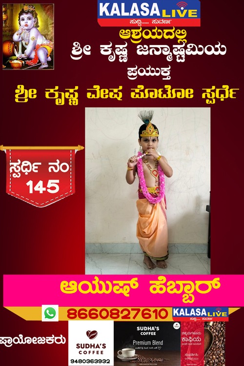 ಕಳಸ ಕಳಸ ತಾಲ್ಲೂಕು ಶ್ರೀ ಕೃಷ್ಣ ವೇಷ ಸ್ಪರ್ಧೆ ಸ್ಪರ್ಧಿ ನಂ:145 ಆಯುಷ್ ಹೆಬ್ಬಾರ್, SUDISH SUVARNA August 28, 2022 Spread the love Post navigation Previous ಶ್ರೀ ಕೃಷ್ಣ ವೇಷ ಸ್ಪರ್ಧೆ ಸ್ಪರ್ಧಿ ನಂ:144 ಯಶಿಕ ಮೂಲ್ಯ,Next ಶ್ರೀ ಕೃಷ್ಣ ವೇಷ ಸ್ಪರ್ಧೆ ಸ್ಪರ್ಧಿ ನಂ:147 ಯಾದ್ವಿ, Leave a Reply Cancel replyYour email address will not be published. Required fields are marked *Comment * Name * Email * Website Save my name, email, and website in this browser for the next time I comment. Related Stories ಹೊರನಾಡಿನಲ್ಲಿ ಪೊರಿಪಿನ ಮಾತೆ ಜಲದುರ್ಗೆ ನಾಟಕ ಏಪ್ರಿಲ್ 19ಕ್ಕೆ ಕಳಸ ತಾಲ್ಲೂಕು ಕ್ರೀಡೆ ಹೊರನಾಡು ಹೊರನಾಡಿನಲ್ಲಿ ಪೊರಿಪಿನ ಮಾತೆ ಜಲದುರ್ಗೆ ನಾಟಕ ಏಪ್ರಿಲ್ 19ಕ್ಕೆ April 18, 2026 ಕಳಸದಲ್ಲಿ ಕಾಡುಕೋಣನ ಅಟ್ಟಹಾಸಕ್ಕೆ ಬಲಿಯಾದ ಬಡ ಕಾರ್ಮಿಕ; ತಬ್ಬಲಿಯಾದ ಪುಟ್ಟ ಕಂದಮ್ಮ, ಗರ್ಭಿಣಿ ಪತ್ನಿಯ ಆಕ್ರಂದನ ಕಳಸ ಕಳಸ ತಾಲ್ಲೂಕು ಕ್ರೈಂ ಕಳಸದಲ್ಲಿ ಕಾಡುಕೋಣನ ಅಟ್ಟಹಾಸಕ್ಕೆ ಬಲಿಯಾದ ಬಡ ಕಾರ್ಮಿಕ; ತಬ್ಬಲಿಯಾದ ಪುಟ್ಟ ಕಂದಮ್ಮ, ಗರ್ಭಿಣಿ ಪತ್ನಿಯ ಆಕ್ರಂದನ April 18, 2026 ಬಾಳೆಹೊಳೆ: 23ನೇ ವರ್ಷದ ‘ವಸಂತ ವೇದ ಶಿಬಿರ’ಕ್ಕೆ ಚಾಲನೆ ಕಳಸ ಕಳಸ ತಾಲ್ಲೂಕು ಧಾರ್ಮಿಕ ಬಾಳೆಹೊಳೆ: 23ನೇ ವರ್ಷದ ‘ವಸಂತ ವೇದ ಶಿಬಿರ’ಕ್ಕೆ ಚಾಲನೆ April 17, 2026