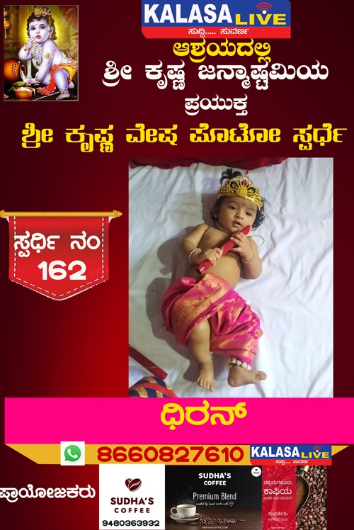 ಕಳಸ ಕಳಸ ತಾಲ್ಲೂಕು ಶ್ರೀ ಕೃಷ್ಣ ವೇಷ ಸ್ಪರ್ಧೆ ಸ್ಪರ್ಧಿ ನಂ:162 ಧಿರನ್, SUDISH SUVARNA August 28, 2022 Spread the love Post navigation Previous ಶ್ರೀ ಕೃಷ್ಣ ವೇಷ ಸ್ಪರ್ಧೆ ಸ್ಪರ್ಧಿ ನಂ:161 ಧನ್ವಿಕ ವಿ ಜೈನ್,Next ಶ್ರೀ ಕೃಷ್ಣ ವೇಷ ಸ್ಪರ್ಧೆ ಸ್ಪರ್ಧಿ ನಂ:163 ಬ್ರಿಯಾನ್ ತಾವ್ರೋ, Leave a Reply Cancel replyYour email address will not be published. Required fields are marked *Comment * Name * Email * Website Save my name, email, and website in this browser for the next time I comment. Related Stories ಹೊರನಾಡಿನಲ್ಲಿ ಪೊರಿಪಿನ ಮಾತೆ ಜಲದುರ್ಗೆ ನಾಟಕ ಏಪ್ರಿಲ್ 19ಕ್ಕೆ ಕಳಸ ತಾಲ್ಲೂಕು ಕ್ರೀಡೆ ಹೊರನಾಡು ಹೊರನಾಡಿನಲ್ಲಿ ಪೊರಿಪಿನ ಮಾತೆ ಜಲದುರ್ಗೆ ನಾಟಕ ಏಪ್ರಿಲ್ 19ಕ್ಕೆ April 18, 2026 ಕಳಸದಲ್ಲಿ ಕಾಡುಕೋಣನ ಅಟ್ಟಹಾಸಕ್ಕೆ ಬಲಿಯಾದ ಬಡ ಕಾರ್ಮಿಕ; ತಬ್ಬಲಿಯಾದ ಪುಟ್ಟ ಕಂದಮ್ಮ, ಗರ್ಭಿಣಿ ಪತ್ನಿಯ ಆಕ್ರಂದನ ಕಳಸ ಕಳಸ ತಾಲ್ಲೂಕು ಕ್ರೈಂ ಕಳಸದಲ್ಲಿ ಕಾಡುಕೋಣನ ಅಟ್ಟಹಾಸಕ್ಕೆ ಬಲಿಯಾದ ಬಡ ಕಾರ್ಮಿಕ; ತಬ್ಬಲಿಯಾದ ಪುಟ್ಟ ಕಂದಮ್ಮ, ಗರ್ಭಿಣಿ ಪತ್ನಿಯ ಆಕ್ರಂದನ April 18, 2026 ಬಾಳೆಹೊಳೆ: 23ನೇ ವರ್ಷದ ‘ವಸಂತ ವೇದ ಶಿಬಿರ’ಕ್ಕೆ ಚಾಲನೆ ಕಳಸ ಕಳಸ ತಾಲ್ಲೂಕು ಧಾರ್ಮಿಕ ಬಾಳೆಹೊಳೆ: 23ನೇ ವರ್ಷದ ‘ವಸಂತ ವೇದ ಶಿಬಿರ’ಕ್ಕೆ ಚಾಲನೆ April 17, 2026