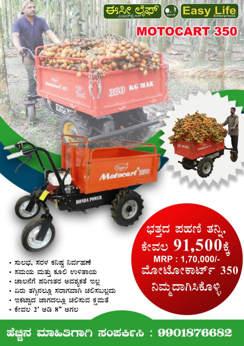 ಈಸೀ ಲೈಫ್ ನಿಂದ 125 ಕೆ.ಜಿ ಮತ್ತು 350 ಕೆ.ಜಿ ತೂಕದ ವಸ್ತುಗಳನ್ನು ಸಾಗಿಸುವ ಸಾಮಥ್ರ್ಯವುಳ್ಳ ಅತೀ ಕಡಿಮೆ ನಿರ್ವಹಣೆಯ ಎರಡು ರೀತಿಯ ಮೋಟೋಕಾರ್ಟ್ ಸಬ್ಸಿಡಿನೊಂದಿಗೆ ಲಭ್ಯವಿದೆ.