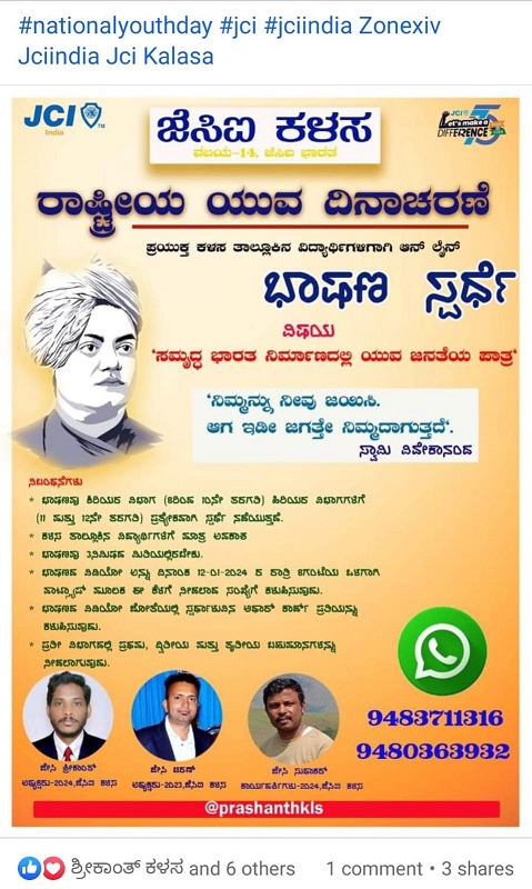 ರಾಷ್ಟ್ರೀಯ ಯುವ ದಿನಾಚರಣೆ ಅಂಗವಾಗಿ ಕಳಸ ತಾಲೂಕಿನ ಪ್ರೌಢ ಹಾಗೂ ಕಾಲೇಜು ವಿದ್ಯಾರ್ಥಿಗಳಗೆ ಕಳಸ ಜೆಸಿಐ ಸಂಸ್ಥೆಯು ಆನ್ ಲೈನ್ ಭಾಷಣ ಸ್ಪರ್ಧೆಯನ್ನು ಏರ್ಷಡಿಸಿದೆ.