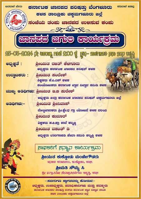 ಕರ್ನಾಟಕ ಜಾನಪದ ಪರಿಷತ್ತು ಕಳಸ ತಾಲ್ಲೂಕು ಘಟಕದ ವತಿಯಿಂದ ಮಾ 25ಕ್ಕೆ ಜಾನಪದ ಜಗುಲಿ ಕಾರ್ಯಕ್ರಮ ನಡೆಯಲಿದೆ.