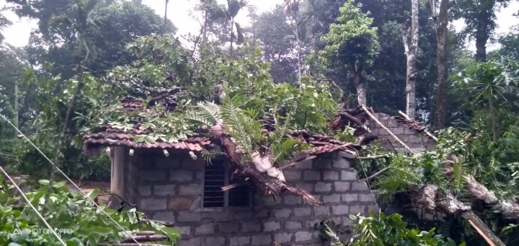 ಶುಕ್ರವಾರದ ಬೆಳಗ್ಗಿನ 4 ಗಂಟೆಯ ಸಮಯದಲ್ಲಿ ಮನೆಯವರೆಲ್ಲ ಗಾಡ ನಿದ್ರೆಯಲ್ಲಿದ್ದ ಸಂದರ್ಭದಲ್ಲಿ ಮನೆಯ ಹಿಂದೆ ಇದ್ದ ಬೃಹತ್ ಗಾತ್ರದ ಮರ ಮನೆಯ ಮೇಲೆ ಬಿದ್ದಿದೆ.ಈ ಸಂದರ್ಭದಲ್ಲಿ ಅಕ್ಕ ಪಕ್ಕದ ಮನೆಯವರು ಬಂದು ಮನೆಯಲ್ಲಿದ್ದವರನ್ನು ಎಳೆದು ಹೊರ ಹಾಕಿದ್ದಾರೆ.