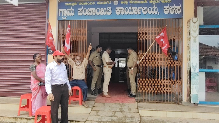 ಕಳಸ ಕೈಮರ ಸಮೀಪ ಸರ್ವೆ ನಂ 641ರಲ್ಲಿ ಖಾಸಾಗಿ ವ್ಯಕ್ತಿಯೊಬ್ಬರು ಸರ್ಕಾರಿ ಭೂಮಿಯನ್ನು ಬಳಸಿಕೊಂಡು ಅನಧಿಕೃತವಾಗಿ ಕಟ್ಟಡ ನಿರ್ಮಿಸುತ್ತಿದ್ದು ಕೂಡಲೇ ತೆರವು ಮಾಡಿ ಯಥಾಸ್ಥಿತಿ ಕಾಪಾಡಿಕೊಳ್ಳಬೇಕು ಎಂದು ಭಾರತೀಯ ಕಮ್ಯೂನಿಷ್ಟ್ ಪಕ್ಷದ ಮುಖಂಡರಿಬ್ಬರು ಕಳಸ ಗ್ರಾಮ ಪಂಚಾಯಿತಿ ಮುಂಭಾಗ ಬುಧವಾರ ಪ್ರತಿಭಟನೆ ನಡೆಸಿದರು.