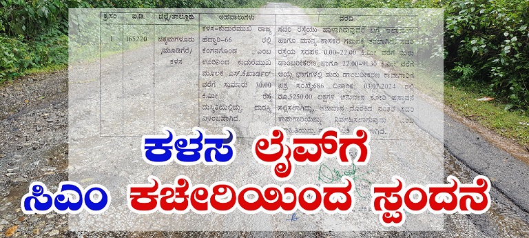 ಕಳಸ ತಾಲೂಕಿನ ಕಳಸ-ಕುದುರೆಮುಖ ರಾಜ್ಯ ಹೆದ್ದಾರಿಯ ಕೆಂಗನಕೊ0ಡದಿ0ದ ಎಸ್.ಕೆ.ಬಾರ್ಡ್ರ್ ವರೆಗೆ ಸುಮಾರು 30ಕಿಮೀ ದೂರ ರಸ್ತೆ ತೀರ ಶಿಥಿಲಗೊಂಡಿರುವ ಬಗ್ಗೆ ಕಳಸ ಲೈವ್ ಮುಖ್ಯಮಂತ್ರಿಗಳ ಸಾರ್ವಜನಿಕ ಕುಂದು ಕೊರತೆ ವಿಭಾಗ ಜನಸ್ಪಂದನಕ್ಕೆ ದೂರು ಸಲ್ಲಿಸಿತ್ತು.