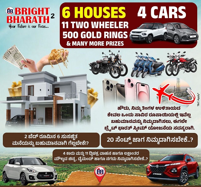 ಪುತ್ತೂರು: ಮೊದಲ ಸೀಸನ್’ನ ಯಶಸ್ವಿ ಪಯಣದೊಂದಿಗೆ, ಸಾವಿರಾರು ಸಂತೃಪ್ತ ಗ್ರಾಹಕರನ್ನು ಪಡೆದ “ಬ್ರೈಟ್ ಭಾರತ್” ಸಂಸ್ಥೆ ಇದೀಗ ಈ ಭಾಗದಲ್ಲಿ ಪ್ರಪ್ರಥಮ ಬಾರಿಗೆ, ಆರು ಸುಸಜ್ಜಿತ ಮನೆಯೊಂದಿಗೆ ನಾಲ್ಕು ಐಶಾರಾಮಿ ಕಾರು, ನಾಲ್ಕು ಸುಸಜ್ಜಿತ ಜಾಗ, ಚಿನ್ನ, ಡೈಮಂಡ್’ಗಳನ್ನು ಬಹುಮಾನವಾಗಿ ನೀಡುವ ಮತ್ತೊಂದು ಹೊಸ ಯೋಜನೆಯನ್ನು ಬಿಡುಗಡೆಗೊಳಿಸಿದೆ.
