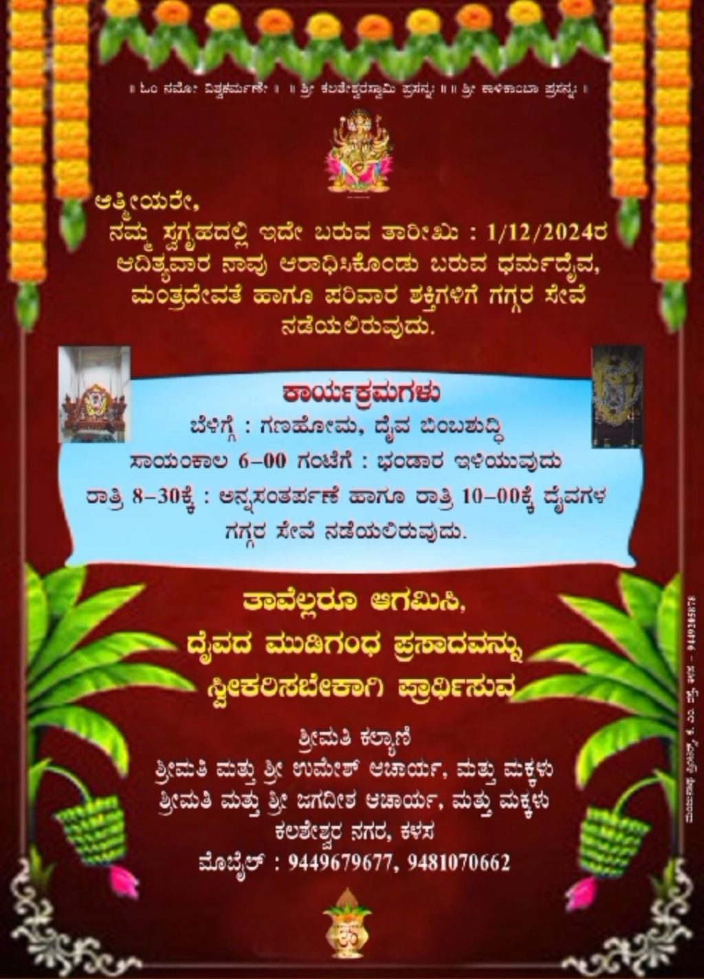 ಕಳಸ ಕಲಶೇಶ್ವರ ನಗರ ಉಮೇಶ್ ಆಚಾರ್ಯರವ ಮನೆಯಲ್ಲಿ ಡಿಸೆಂಬರ್ 1 ರ ಭಾನುವಾರದಂದು ಧರ್ಮ ದೈವ, ಮಂತ್ರ ದೇವತೆ ಹಾಗೂ ಪರಿವಾರ ಶಕ್ತಿಗಳಿಗೆ ನೇಮೋತ್ಸವ ನಡೆಯಲಿದೆ.
