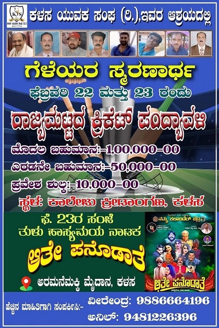 ಕಳಸ ಯುವಕ ಸಂಘ ಇವರ ಆಶ್ರಯದಲ್ಲಿ ಗೆಳೆಯರ ಸ್ಮರಣಾರ್ಥವಾಗಿ ರಾಜ್ಯ ಮಟ್ಟದ ಕ್ರಿಕೆಟ್ ಪಂದ್ಯಾವಳಿ 2025ರ ಫೆಬ್ರವರಿ 22 ಮತ್ತು 23ರಂದು ನಡೆಯಲಿದೆ.