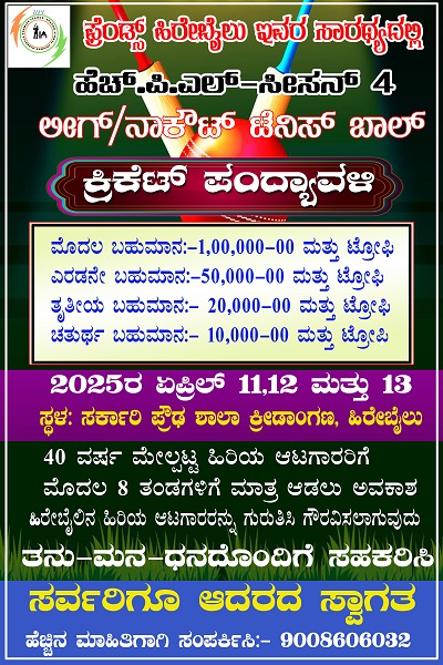 ಫ್ರೆಂಡ್ಸ್ ಹಿರೇಬೈಲು ಇವರ ಸಾರಥ್ಯದಲ್ಲಿ ಹೆಚ್.ಪಿ.ಎಲ್ ಸೀಸನ್ 4 ಲೀಗ್/ನಾಕೌಟ್ ಟೆನಿಸ್ ಬಾಲ್ ಕ್ರಿಕೆಟ್ ಪಂದ್ಯಾವಳಿ ಏಪ್ರಿಲ್ 10,11,12 ಮತ್ತು 13ರಂದು ಸರ್ಕಾರಿ ಪ್ರೌಢ ಶಾಲಾ ಕ್ರೀಡಾಂಗಣ ಹಿರೇಬೈಲ್ ನಲ್ಲಿ ನಡೆಯಲಿದೆ.