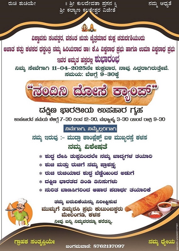 ಹತ್ತು ಹಲವು ವಿಭಿನ್ನ ಮತ್ತು ವಿವಿಧ ರೀತಿಯ ರುಚಿ ಶುಚಿಯಾದ ನಂದಿನಿ ವೆಜ್ ದೋಸೆ ಕ್ಯಾಂಪ್ ಕಳಸದ ಮುದ್ರಾ ಕಾಂಪ್ಲೇಕ್ಸ್ ಬಳಿ ಇದೇ ತಿಂಗಳ 11 ರಂದು ಶುಭಾರಂಭಗೊಳ್ಳಲಿದೆ.