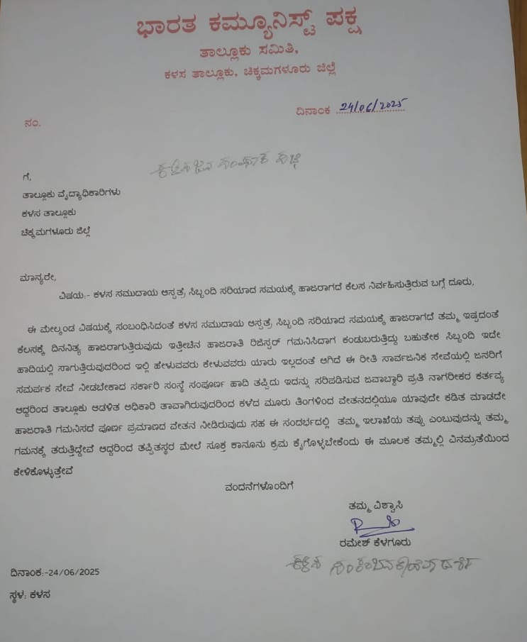 ಈ ಬಗ್ಗೆ ತಾಲ್ಲೂಕು ವೈದ್ಯಾಧಿಕಾರಿಗಳಿಗೆ ಮನವಿ ಸಲ್ಲಿಸಿದ್ದು, ಕಳಸ ಸಮುದಾಯ ಆಸ್ಪತ್ರೆ ಸಿಬ್ಬಂದಿ ಸರಿಯಾದ ಸಮಯಕ್ಕೆ ಹಾಜರಾಗದೆ ತಮ್ಮ ಇಷ್ಟದಂತೆ ಕೆಲಸಕ್ಕೆ ದಿನನಿತ್ಯ ಹಾಜರಾಗುತ್ತಿರುವುದು ಇತ್ತೀಚಿನ ಹಾಜರಾತಿ ರಿಜಿಸ್ಟರ್ ಗಮನಿಸಿದಾಗ ಕಂಡುಬರುತ್ತಿದ್ದು, ಬಹುತೇಕ ಸಿಬ್ಬಂದಿ ಇದೇ ಹಾದಿಯಲ್ಲಿ ಸಾಗುತ್ತಿರುವುದರಿಂದ ಇಲ್ಲಿ ಹೇಳುವವರು ಕೇಳುವವರು ಯಾರು ಇಲ್ಲದಂತೆ ಆಗಿದೆ. ಈ ರೀತಿ ಸಾರ್ವಜನಿಕ ಸೇವೆಯಲ್ಲಿ ಜನರಿಗೆ ಸಮರ್ಪಕ ಸೇವೆ ನೀಡಬೇಕಾದ ಸರ್ಕಾರಿ ಸಂಸ್ಥೆ ಸಂಪೂರ್ಣ ಹಾದಿ ತಪ್ಪಿದ್ದು, ಇದನ್ನು ಸರಿಪಡಿಸುವ ಜವಾಬ್ದಾರಿ ಪ್ರತಿ ನಾಗರೀಕರ ಕರ್ತವ್ಯ ಅದ್ದರಿಂದ ತಾಲ್ಲೂಕು ಆಡಳಿತ ಅಧಿಕಾರಿ ತಾವಾಗಿರುವುದರಿಂದ ಕಳೆದ ಮೂರು ತಿಂಗಳಿAದ ವೇತನದಲ್ಲಿಯೂ ಯಾವುದೇ ಕಡಿತ ಮಾಡದೇ ಹಾಜರಾತಿ ಗಮನಿಸದೆ ಪೂರ್ಣ ಪ್ರಮಾಣದ ವೇತನ ನೀಡಿರುವುದು ಸಹ ಈ ಸಂದರ್ಭದಲ್ಲಿ ತಮ್ಮ ಇಲಾಖೆಯ ತಪ್ಪು ಎಂಬುವುದನ್ನು ತಮ್ಮ ಗಮನಕ್ಕೆ ತರುತ್ತಿದ್ದೇವೆ. ಆದ್ದರಿಂದ ತಪ್ಪಿತಸ್ಥರ ಮೇಲೆ ಸೂಕ್ತ ಕಾನೂನು ಕ್ರಮ ಕೈಗೊಳ್ಳಬೇಕೆಂದು ತಮ್ಮ ಮನವಿಯಲ್ಲಿ ತಿಳಿಸಿದ್ದಾರೆ.