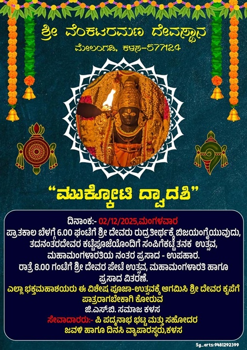 ಕಳಸ ವೆಂಕಟರಮಣ ದೇವಸ್ಥಾನದಲ್ಲಿ ಡಿಸೆಂಬರ್ 2 ರಂದು ಪವಿತ್ರವಾದ “ಮುಕ್ಕೋಟಿ ದ್ವಾದಶಿ” ಯನ್ನು ಶ್ರದ್ಧಾಭಕ್ತಿಯಿಂದ ಆಚರಿಸಲಾಗುವುದು. ಈ ವಿಶೇಷ ದಿನದಂದು ದೇವರಿಗೆ ವಿವಿಧ ಧಾರ್ಮಿಕ ಮತ್ತು ಪೌರಾಣಿಕ ಕಾರ್ಯಕ್ರಮಗಳನ್ನು ಹಮ್ಮಿಕೊಳ್ಳಲಾಗಿದೆ.