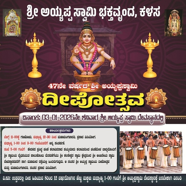 ಇಲ್ಲಿನ ಶ್ರೀ ಅಯ್ಯಪ್ಪಸ್ವಾಮಿ ಭಕ್ತವೃಂದದ ವತಿಯಿಂದ ಶ್ರೀ ಅಯ್ಯಪ್ಪ ಸ್ವಾಮಿ ದೇವಸ್ಥಾನದ ಆವರಣದಲ್ಲಿ ಜೂನ್ 3, 2026ರ ಶನಿವಾರದಂದು ವೈಭವದ “ಶ್ರೀ ಶಬರಿಮಲೆ ಅಯ್ಯಪ್ಪ ಸ್ವಾಮಿ ದೀಪೋತ್ಸವ” ಹಾಗೂ ವಿವಿಧ ಧಾರ್ಮಿಕ ಕಾರ್ಯಕ್ರಮಗಳನ್ನು ಹಮ್ಮಿಕೊಳ್ಳಲಾಗಿದೆ.